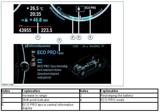 ECO PRO guides the driver to adopt the best possible driving style for fuel consumption. Nevertheless sufficient driving dynamics are present. The driver is also aided in his consumption-optimized driving style by displays (see Owner's Handbook). Intelligent control of energy management and the heating and air conditioning system form the cornerstone of ECO PRO. A real life reduction in consumption of up to 10 % can be achieved.