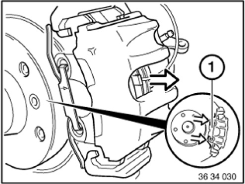 Remove brake pads in direction of arrow. In the event of one-sided brake pad wear, do not change brake pads round.