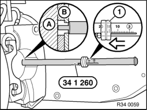 Press special tool onto brake pad. Slide ring (1) in direction of arrow up to stop and read off measured value.
