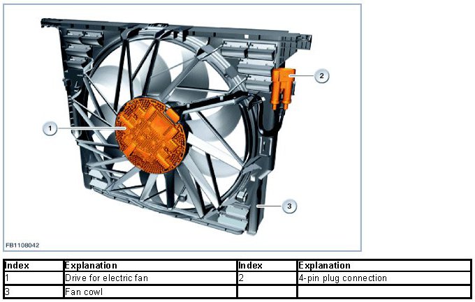 The electric fan is arranged behind the cooler. The Digital Engine Electronics (DME) activate the electric fan.