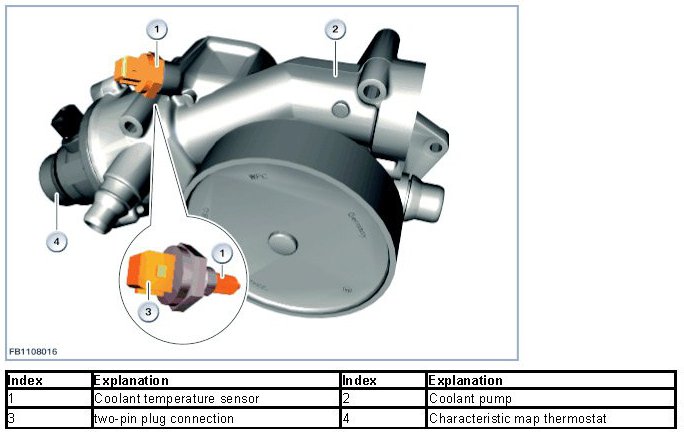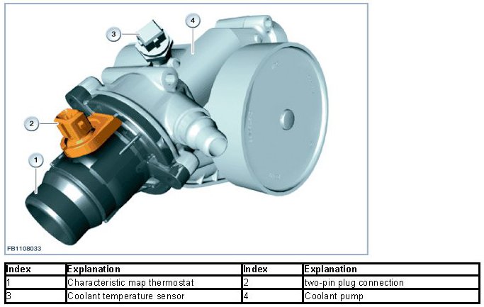 The characteristic map thermostat is also attached to the housing of the coolant pump.