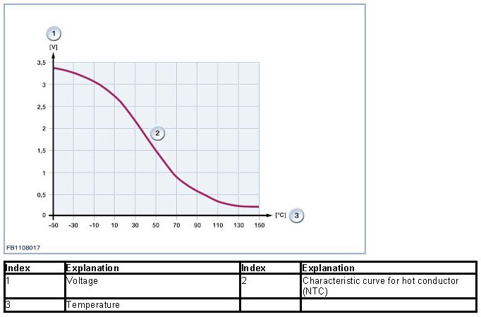 The electrical voltage at the resistor is dependent on the coolant temperature. There is a table stored in the Digital Engine Electronics (DME) that specifies the associated temperature for each voltage value. This compensates for the non-linear relationship between electrical voltage and temperature.