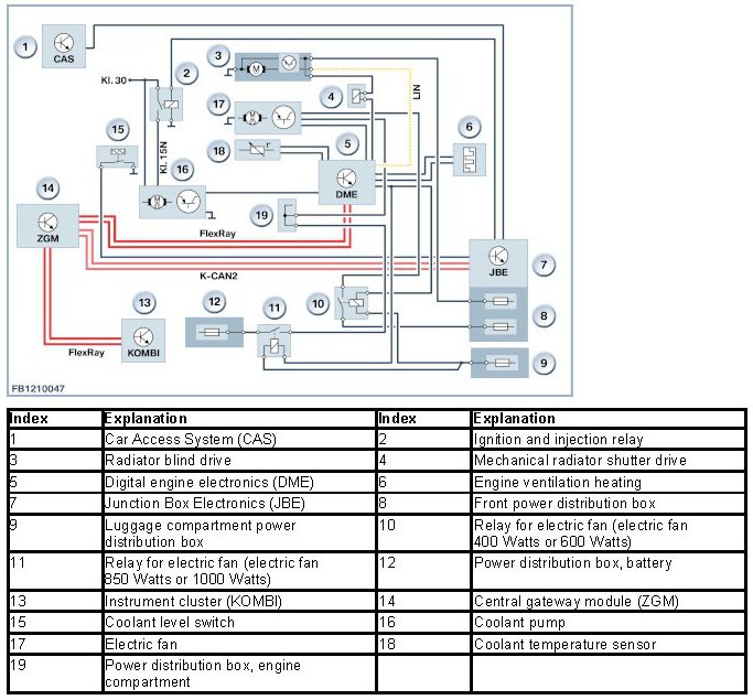 For the after-run of the electric fan, the Digital Engine Electronics (DME) lower the frequency to 10 Hz. The pulse duty factor is used to select the time (maximum 11 minutes) and speed of the electric fan.