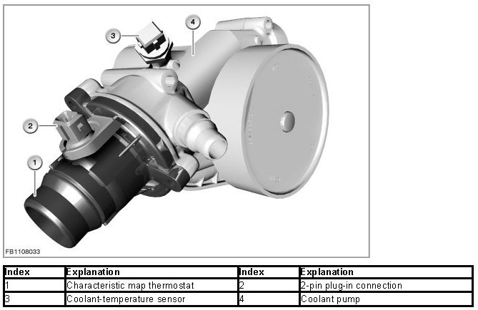 The characteristic map thermostat is attached to the housing of the coolant pump.