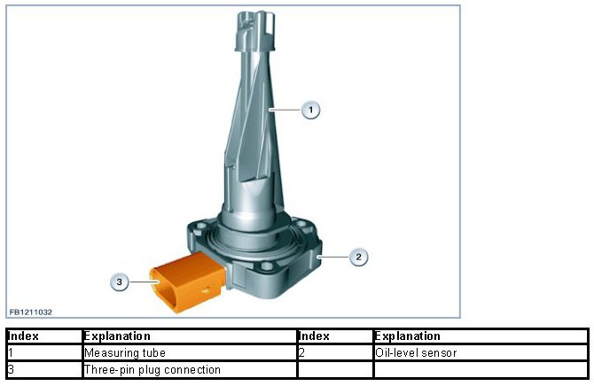 The oil level sensor is attached to the oil sump and is accessible from below. There is no longer an oil dipstick on vehicles with an oil level sensor. These engines have an electronic oil level check. The concept for the display is also new (see Owner's Handbook).