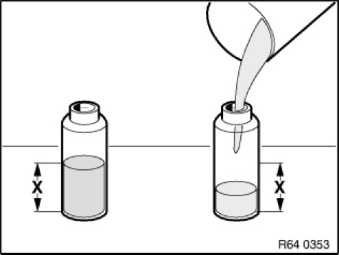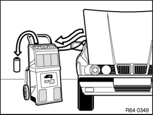 After evacuation, the refrigerant must be filtered in the A/C service station as the oil separator could still contain a liquid refrigerant/oil mixture. The cleaning operation gasifies the refrigerant completely and only the previously bound refrigerant fluid remains in the oil separator. Measure and note down this quantity of refrigerant fluid.