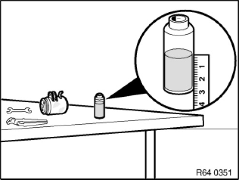 Transfer the refrigerant fluid remaining in the previous compressor via the oil filler plug completely into a measuring cup.