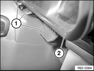 Retaining tabs (1) of dashboard (2) must be exactly seated in mountings of dashboard.
