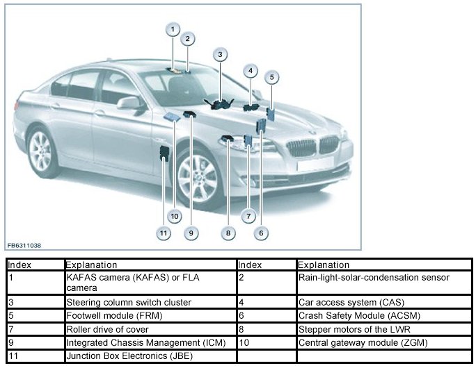 Components can vary depending on the vehicle-specifics and equipment-specifics. For example: The front electronics module (FEM) replaces the footwell module (FRM) in the F3x and the junction box electronics (JBE).