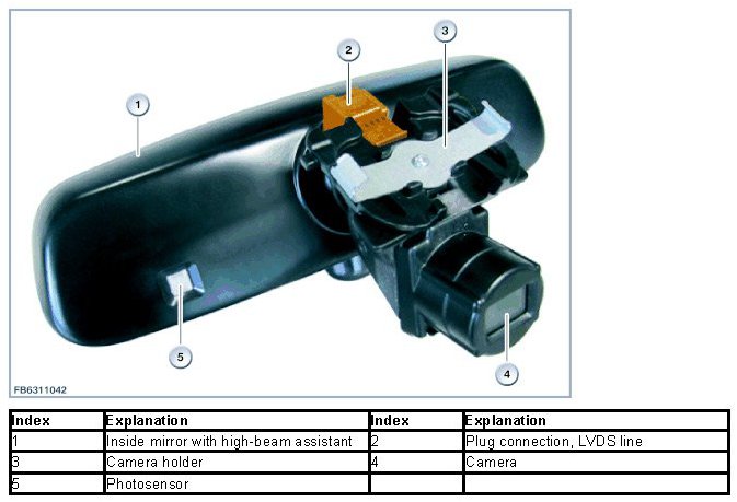The graphic below shows the system network of the non-glare headlight assistant in the inside mirror and LED headlights on the example F30.