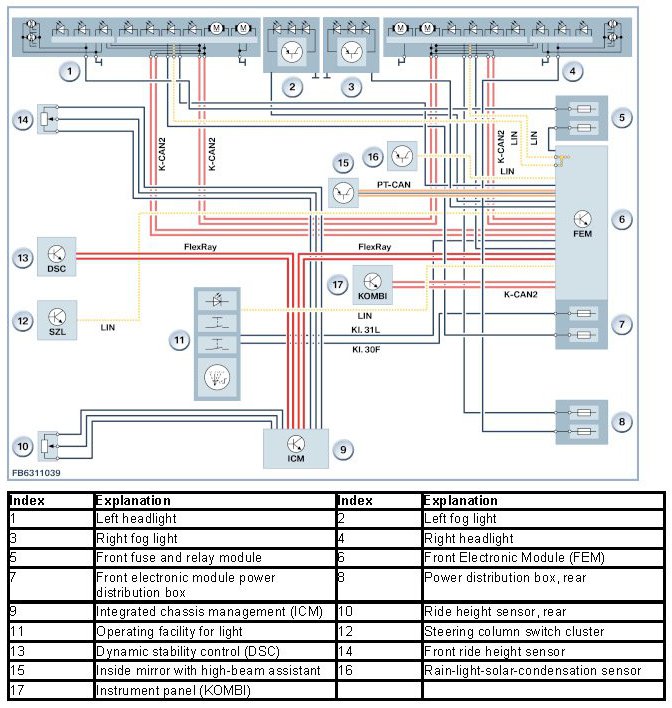The footwell module (FRM) receives many input signals that cause the headlights to be switched on. The footwell module (FRM) forms the interface to the instrument cluster (KOMBI). It enables communication between the LIN bus and the K-CAN and therefore message transmission to the respective other data bus.