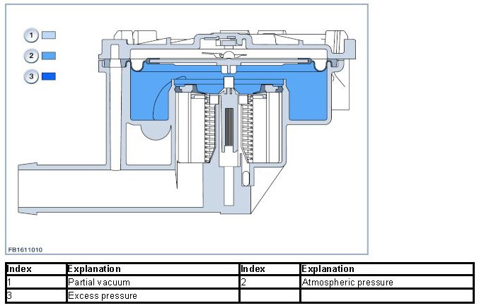 A vacuum in the tank ventilation system raises the top rubber diaphragm against the pressure switch. The pressure switch closes. There is no active air circulation between the fuel tank and surrounding area.The bottom poppet valve is pressed against the seal by the spring. The tank ventilation system is not leaking.