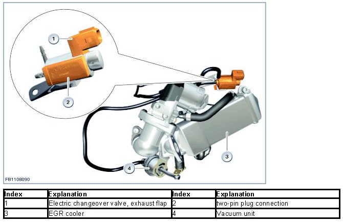 The electric changeover valve is attached to the engine via the exhaust-gas recirculation cooler (EGR cooler). The EGR cooler has a bypass flap with which the exhaust gas can be routed past the EGR cooler. In the warm-up phase of the engine, the bypass flap is opened to get the oxidation catalytic converter to operating temperature more quickly. It also prevents dirt contamination in the EGR cooler by exhaust residues. The bypass flap is adjusted by means of a partial-vacuum canister.