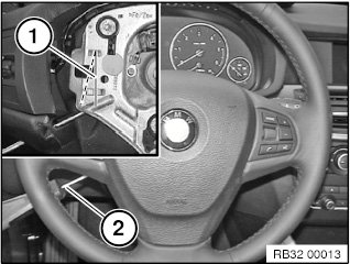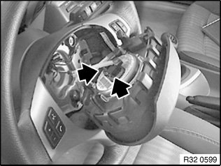 Insert Torx screwdriver T25 (2) at an angle into concealed opening on reverse side of steering wheel until a spring resistance is felt (approx. 1.5 cm).