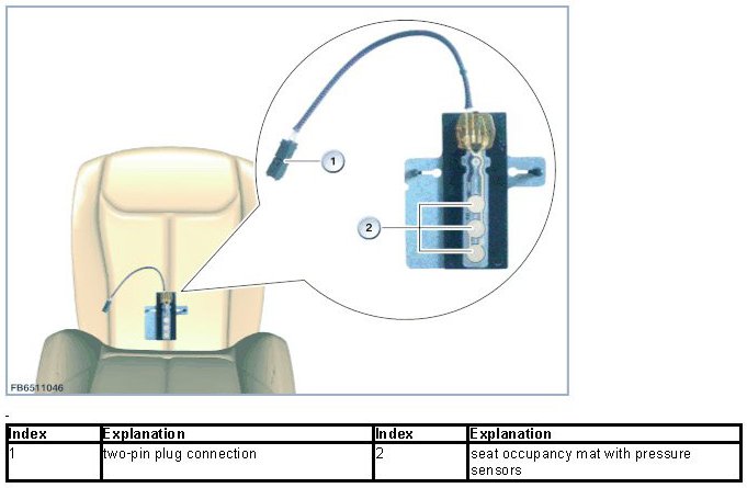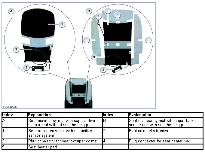 The front passenger seat occupancy detection consists of a seat-occupancy mat with a capacitive sensor system. The occupancy of the front passenger seat is detected by measuring the resistance of the human body.