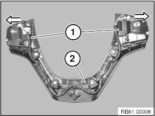 Remove both multifunction steering wheel switches (1) together with trim cover from steering wheel (2) in direction of arrow.