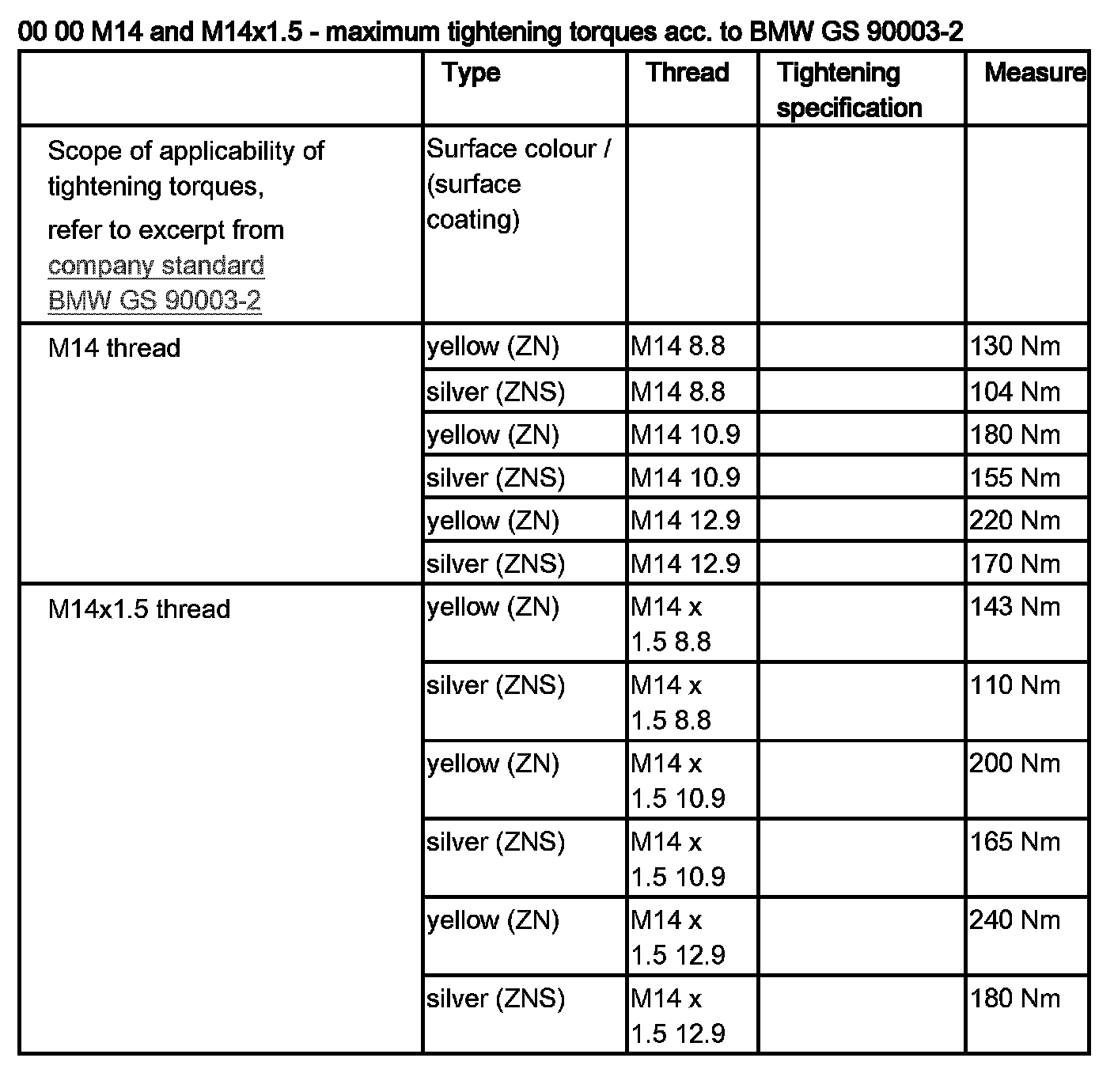 00 00 M14 and M14x1.5 - maximum tightening torques acc. to BMW GS 90003-2