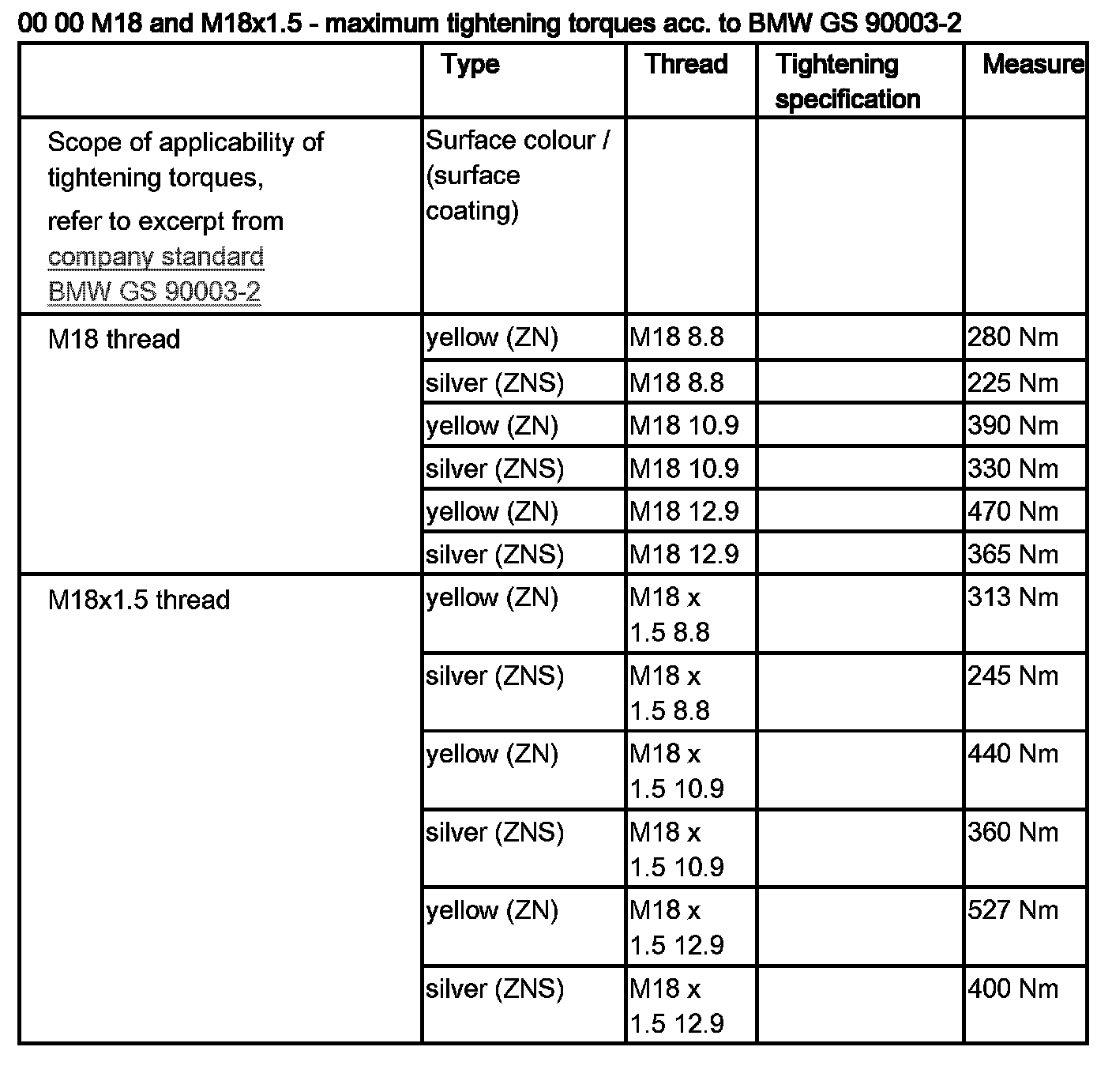 00 00 M18 and M18x1.5 - maximum tightening torques acc. to BMW GS 90003-2