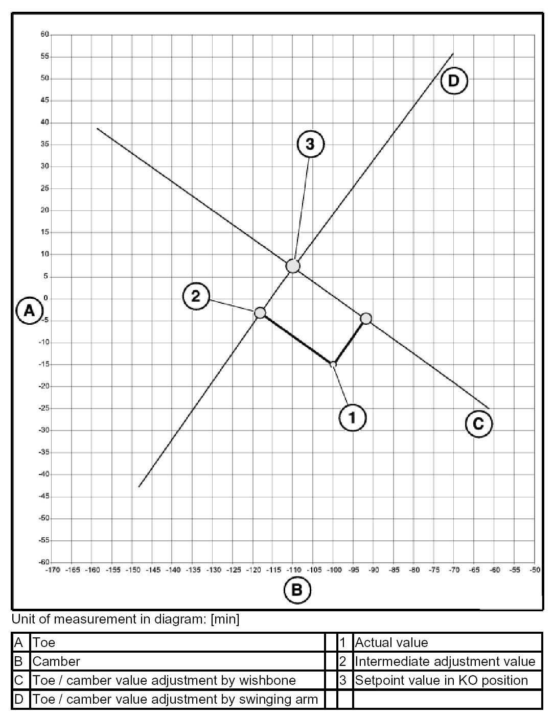 3. Point of intersection (2) on "Swinging arm" line (D) produces toe/camber intermediate adjustment value