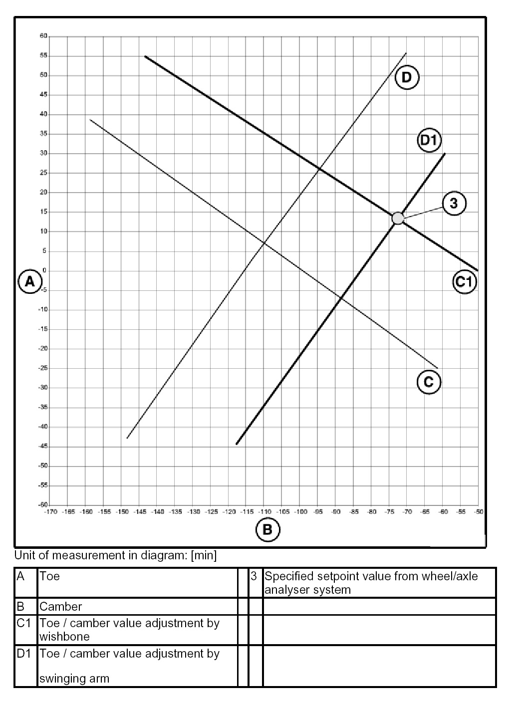 - Point of intersection on "Swinging arm" line (D1) produces toe/camber intermediate adjustment value