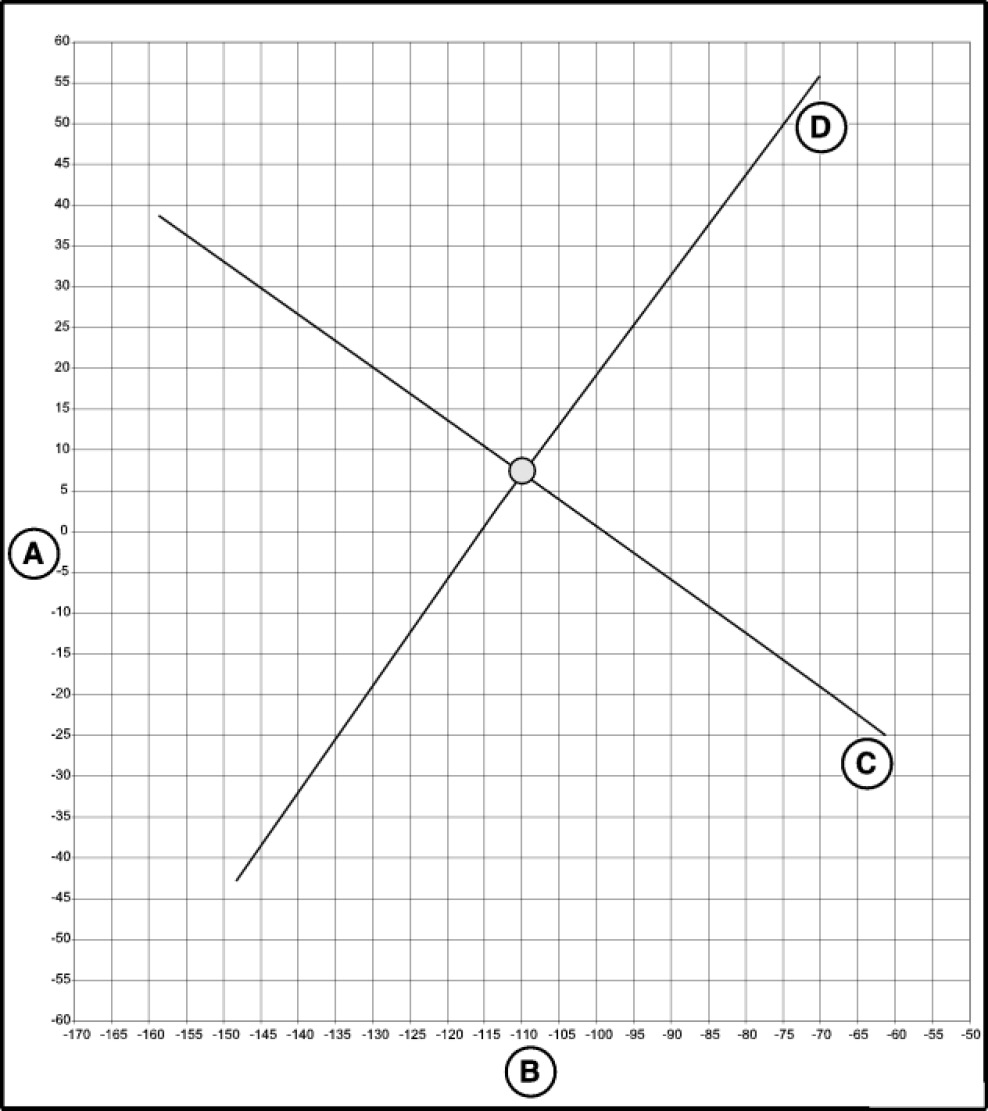 2. Move lines (D) and (C) in parallel so that the point of intersection of the two lines (D1 and C1) is the entered setpoint value