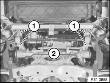 Release screws (1) and tie anti-roll bar (2) to front axle support.
