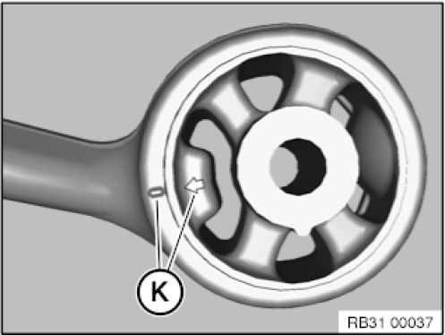 Align rubber mount and trailing link with markings (K) and press into place.