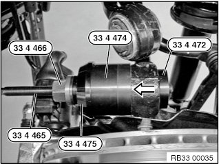 Pull rubber mounts out of the wheel carrier using special tools 33 4 465, 33 4 466, 33 4 472, 33 4 474 and 33 4 475 in the direction of travel.