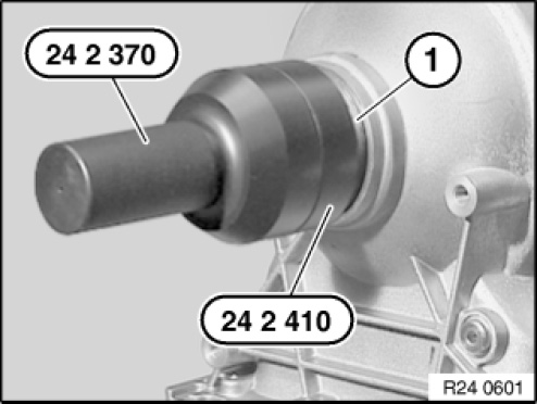 Drive in radial shaft seal (1) with special tool 24 2 370 and adapter ring 24 2 410 as far as it will go.