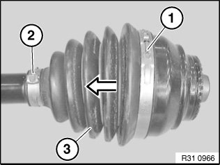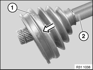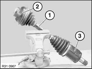 31 60 535 Replacing two gaiters on output shaft(s) (output shaft(s) removed)Grip output shaft (1) in vice with aluminium clamping jaws.