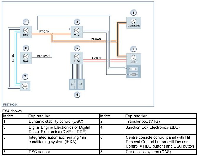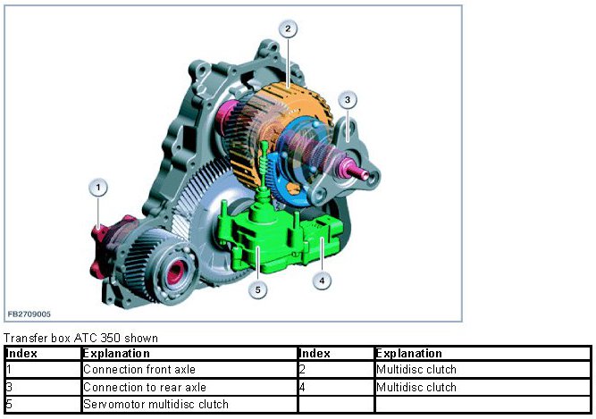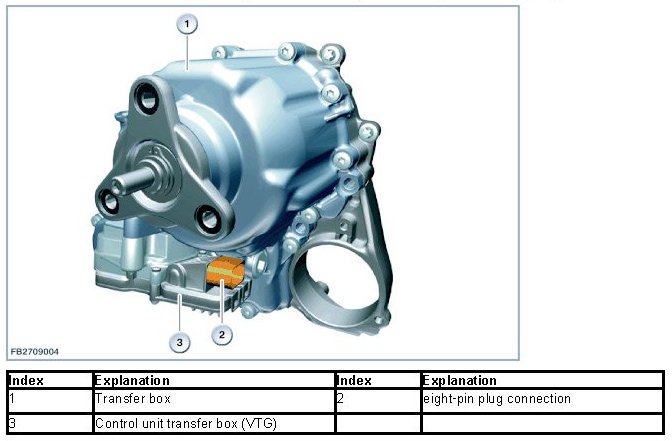 The transfer box control unit and servomotor cannot be replaced individually. They must be replaced together. In consultation with the central driving dynamics control function in the Integrated Chassis Management (ICM) integrated in the master control unit, the Dynamic Stability Control (DSC) stipulates the setpoint value for all-wheel control of the xDrive function. The setpoint value depends on the tendency of the vehicle to oversteer or understeer and the wheel slip. The setpoint value is transmitted to the VTG control unit.