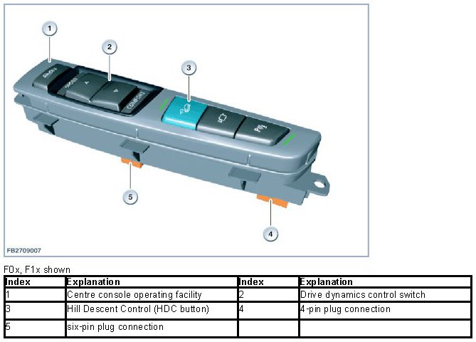 The Hill Descent Control is operated via the centre console operating facility (HDC button). For X1 and X5 in the centre console control panel.