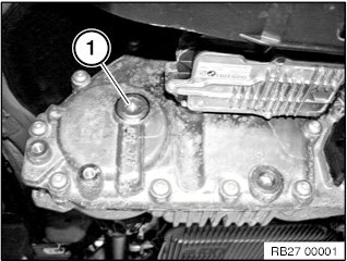Pour in transmission oil up to lower edge of opening for filler plug (1).