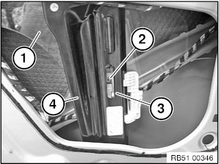 Move door window (1) until the mount stop (2) of the power window regulator can be operated via the recess (3) on the guide rails of the power window regulators (4).