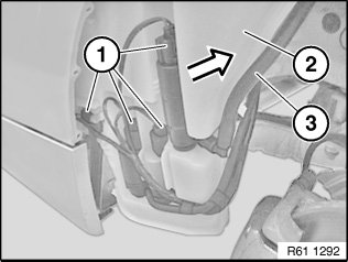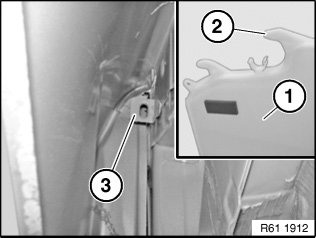 Make sure lug (2) of water reservoir for windscreen washer unit (1) fits correctly in retaining fixture (3).