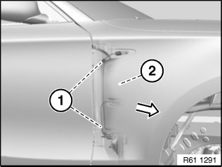 Remove fluid reservoir for windscreen washer system (2) in direction of arrow.