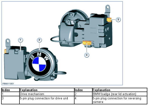 The BMW badge lifts automatically when the reversing camera is switched on. This automatic lifting procedure is executed by a drive unit (motor and gearset).