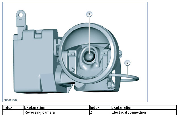 The reversing camera is installed behind the BMW badge (tailgate activation). The reversing camera is connected to the all-round vision camera control unit by the following lines: