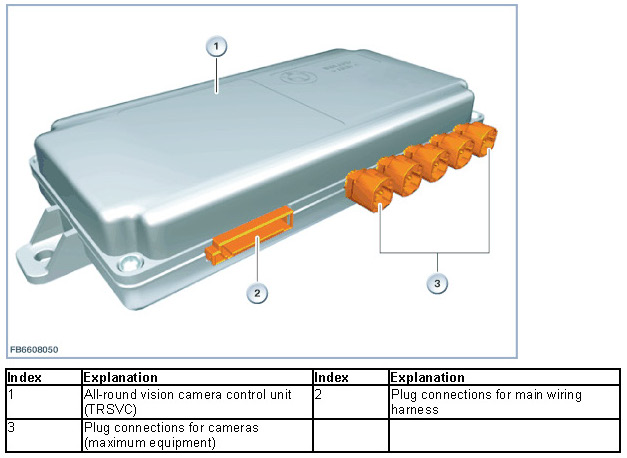 The all-round vision camera control unit is located in the rear left of the luggage compartment. The light points, light colours and light intensities picked up by the reversing camera are evaluated by the all-round vision camera control unit. The reversing camera is connected to the all-round vision camera control unit by a 5-pin line. The all-round vision camera control unit is connected to the body CAN. The TRSVC control unit is supplied by the rear power distribution box via terminal 15N.