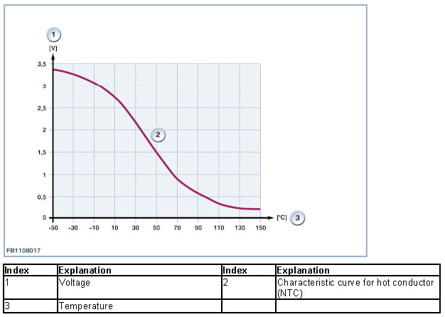 The electrical voltage at the resistor is dependent on the coolant temperature. A table that specifies the temperature associated with each voltage value is stored in the engine control. This compensates for the non-linear relationship between electrical voltage and temperature.