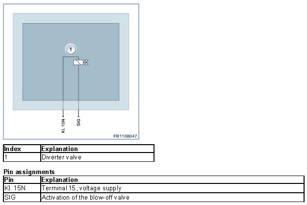 The blow-off valve is a solenoid valve. The blow-off valve is supplied with voltage via terminal 15N. Activation by the engine control occurs on the earth side.