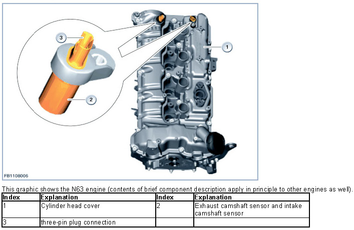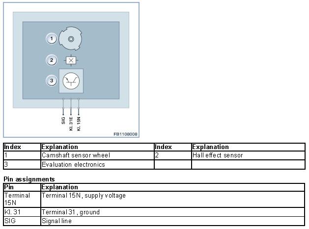 The exhaust camshaft sensor detects the position of the exhaust camshaft with the help of an increment wheel (camshaft sensor wheel) attached to the camshaft. The exhaust camshaft sensor is required for the feedback signal to adjust the exhaust camshaft (VANOS).