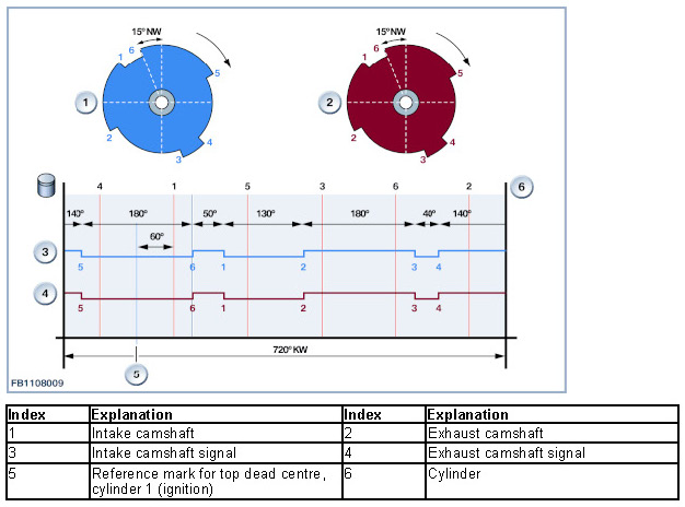 To perform the adjustment, the variable camshaft timing control requires a feedback signal on the current position of the camshaft. Camshaft sensors on the intake and exhaust side record the position of the camshafts. The exhaust camshaft sensor is designed as an inductive hall effect sensor. The camshaft sensor wheel has 6 different flank spacings. The flank spacings are detected by the hall effect sensor.