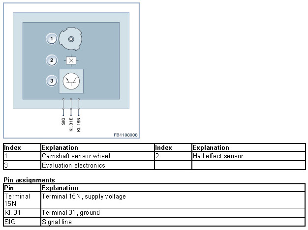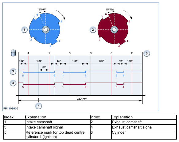 The intake camshaft sensor is designed as an inductive hall effect sensor. The camshaft sensor wheel has 6 different flank spacings. The flank spacings are detected by the hall effect sensor.
