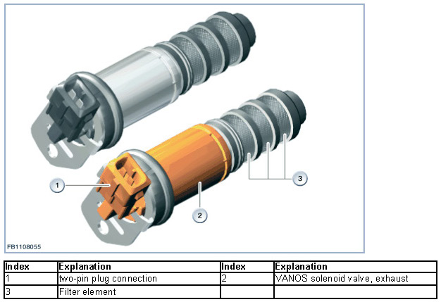 The VANOS solenoid valve, exhaust is connected by means of a 2-pin plug connection.