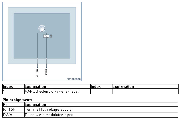 The VANOS solenoid valve, exhaust is a solenoid valve. The VANOS solenoid valve is supplied with voltage via terminal 15N. Activation by the engine control is pulse-width modulated.