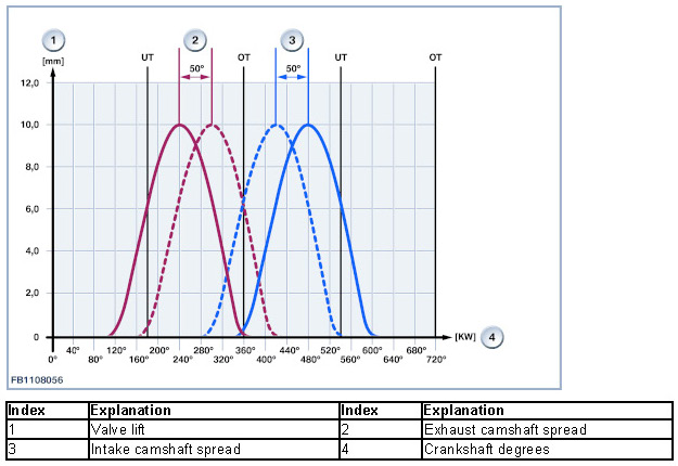 The variable camshaft timing control improves the torque in the lower and middle engine speed range. A greater valve overlap results in lower amounts of residual gas at idle speed. The exhaust-gas recirculation in the partial load range reduces the volume of nitrogen oxide. The following is also achieved: