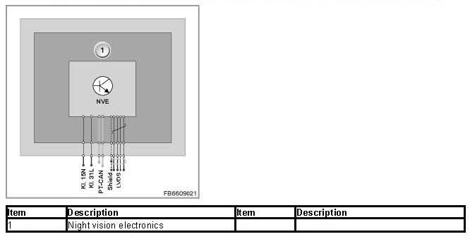The Night Vision camera is activated, e.g. for diagnosis, via the Local CAN. The night vision electronics convert the symmetric video signals received from the Night Vision camera into a CVBS signal.