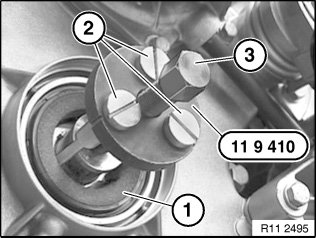 Turn spindle (3) on special tool 11 9 410 to remove radial shaft seal (1).