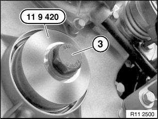 Using special tool 11 9 420 and central bolt (3), screw radial shaft seal into lower gear case cover until flush..